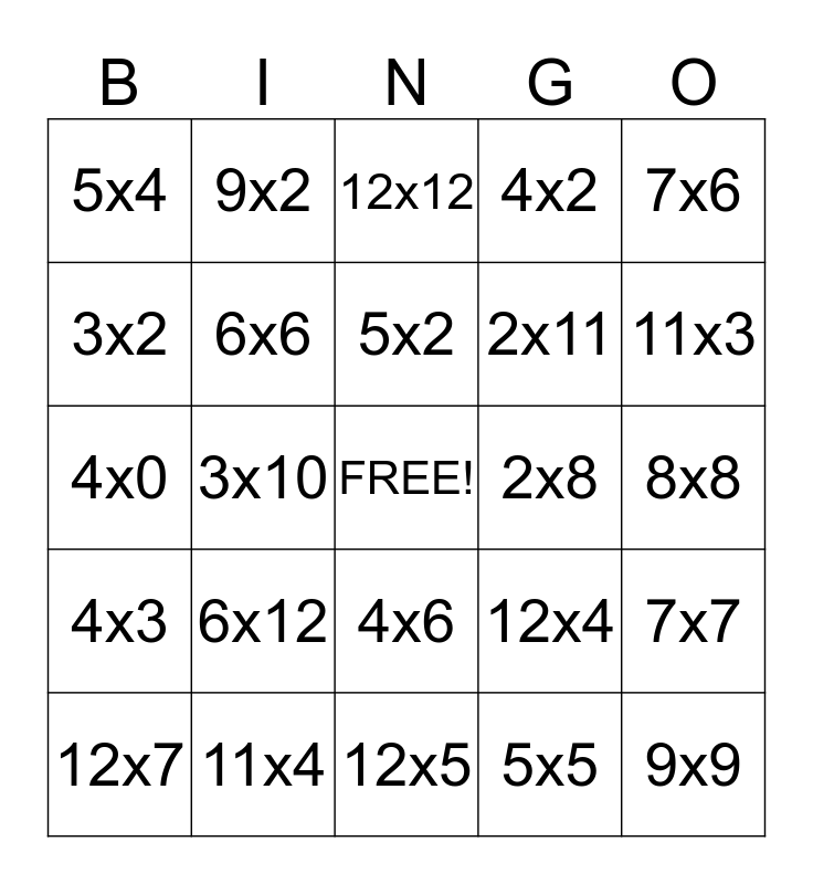 This bingo card has a free space and 24 words: 6x12, 11x4, 5x2, 12x7, 7x6, 5x4, 3x2, 9x2, 2x8, 4x6, 2x11, 4x0, 12x4, 7x7, 6x6, 5x5, 8x8, 12x12, 11x3, 3x10, 9x9, 4x3, 4x2 and 12x5.