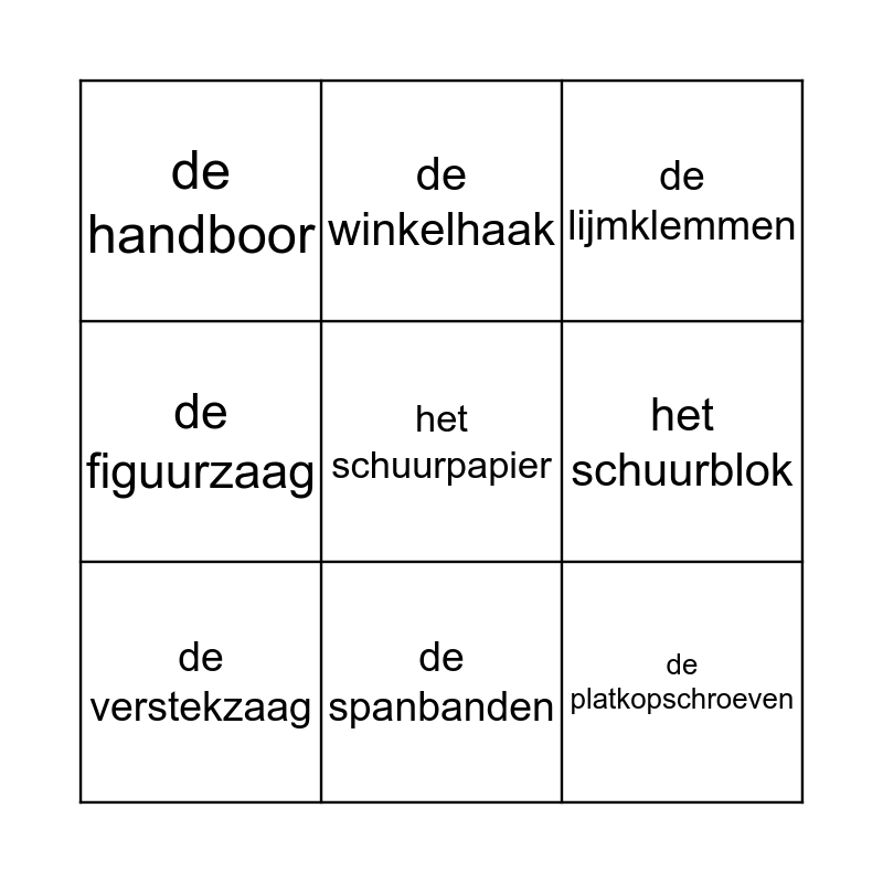 This bingo card has 10 words: de spanbanden, de lijmklemmen, de handboor, het schuurpapier, de figuurzaag, de verstekzaag, de winkelhaak, het plakband, het schuurblok and de platkopschroeven.