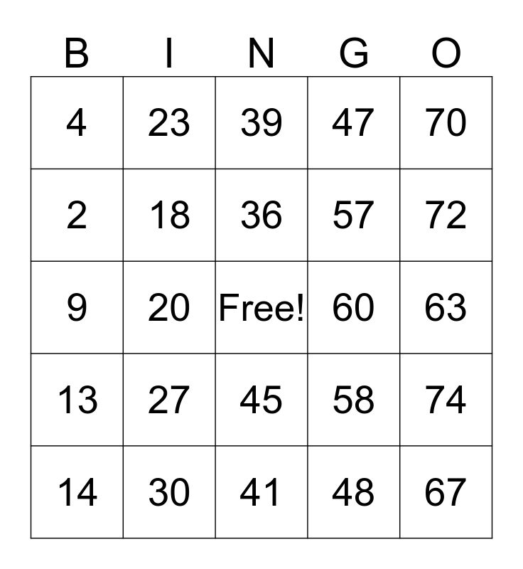 This bingo card has a free space and 24 words: 14, 27, 36, 48, 70, 4, 23, 39, 60, 63, 9, 18, 58, 74, 2, 30, 41, 47, 72, 13, 20, 45, 57 and 67.