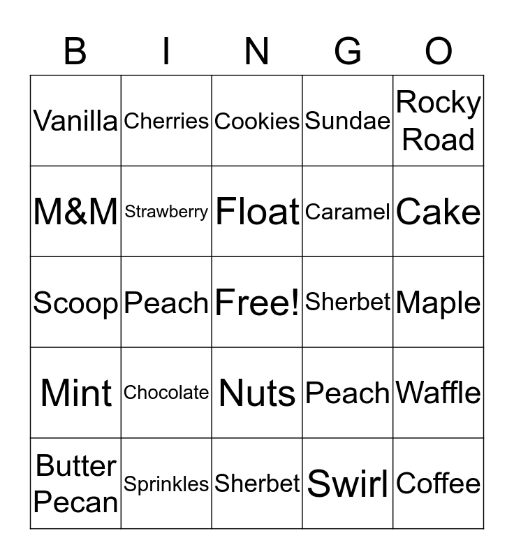 This bingo card has a free space and 24 words: Chocolate, Sprinkles, Float, Butter Pecan, Rocky Road, Vanilla, M&M, Cherries, Sherbet, Nuts, Caramel, Scoop, Peach, Waffle, Strawberry, Swirl, Maple, Cookies, Cake, Peach, Coffee, Mint, Sundae and Sherbet.