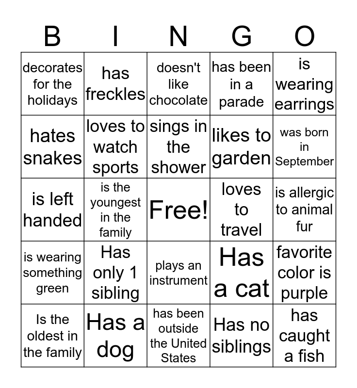 This bingo card has a free space and 24 words: Has only 1 sibling, Has a dog, sings in the shower, Is the oldest in the family, is wearing earrings, decorates for the holidays, hates snakes, has freckles, loves to travel, plays an instrument, likes to garden, is left handed, Has a cat, favorite color is purple, loves to watch sports, Has no siblings, is allergic to animal fur, doesn't like chocolate, was born in September, is the youngest in the family, has caught a fish, is wearing something green, has been in a parade and has been outside the United States.
