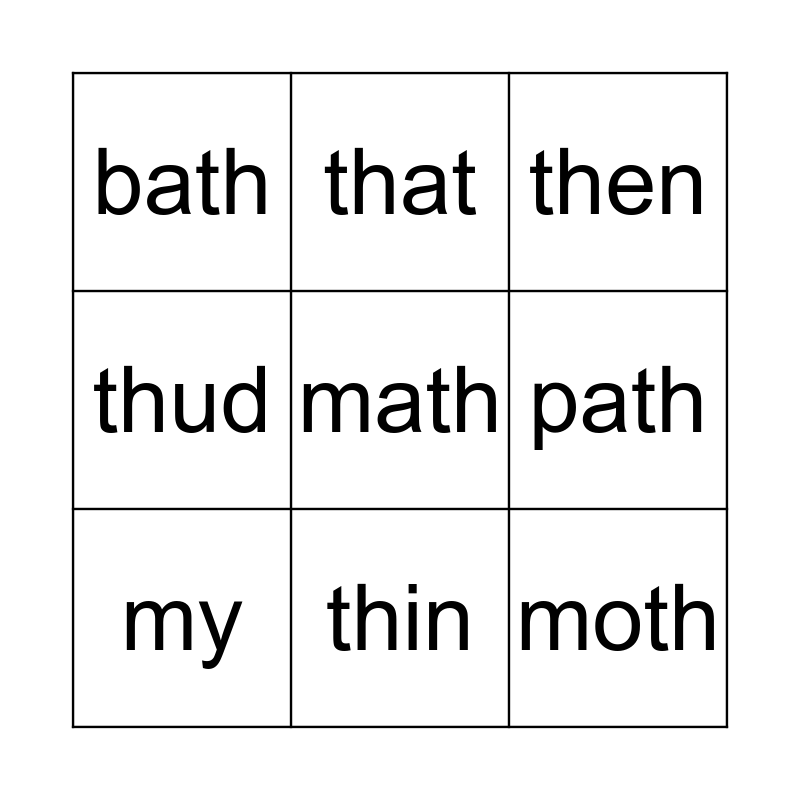 This bingo card has 9 words: my, then, that, thud, bath, path, math, moth and thin.