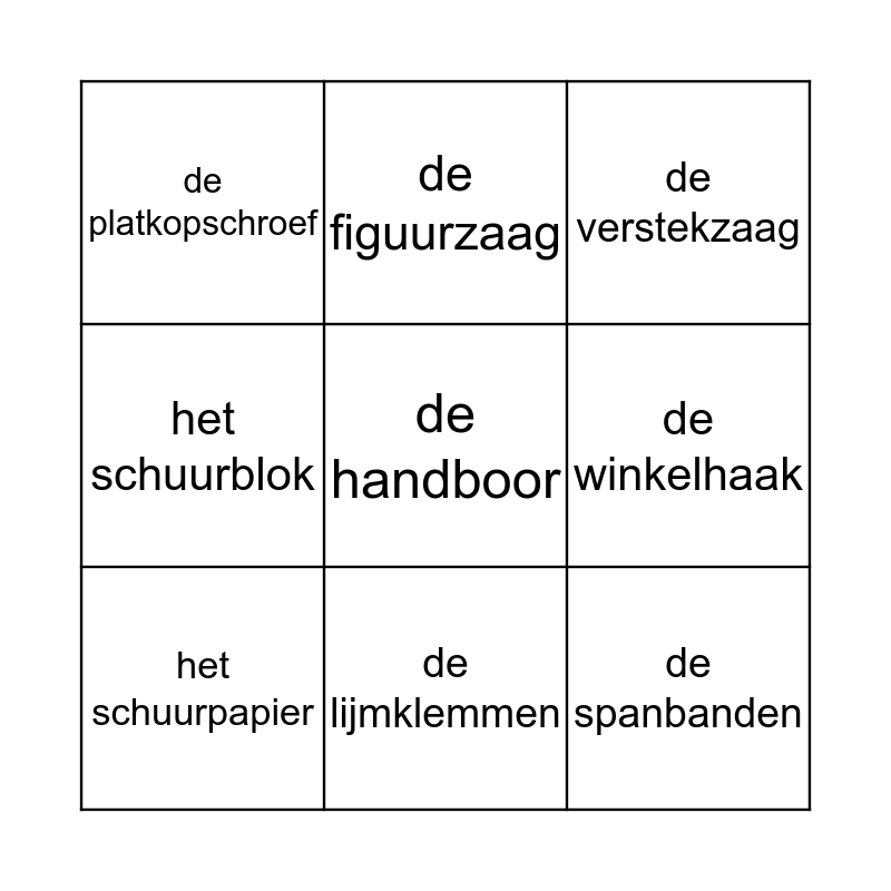 This bingo card has 11 words: de spanbanden, de lijmklemmen, de handboor, het schuurpapier, de figuurzaag, de verstekzaag, de winkelhaak, het plakband, het schuurblok, de platkopschroef and de houtlijm.