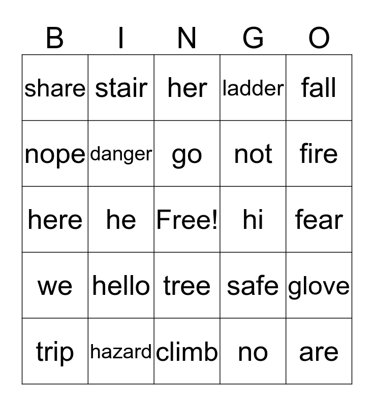 This bingo card has a free space and 24 words: hello, hazard, go, trip, fall, share, nope, stair, hi, tree, not, here, safe, glove, danger, no, fear, her, fire, he, are, we, ladder and climb.