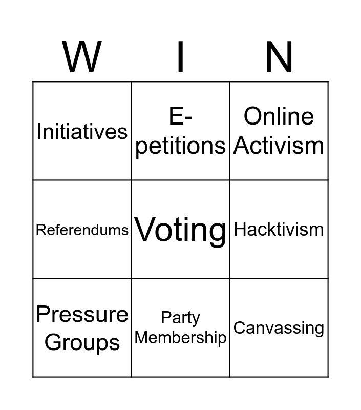 This bingo card has 11 words: Canvassing, Party Membership, Voting, Pressure Groups, E-petitions, Online Activism, Hacktivism, Protests, Referendums, Initiatives and Clicktivism.