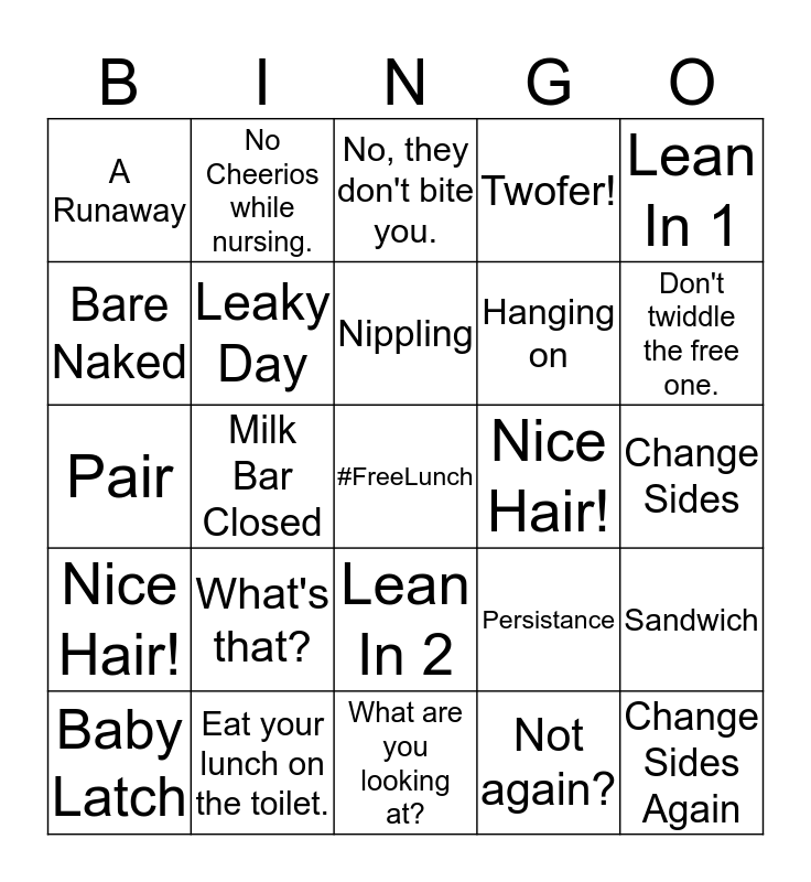 This bingo card has a free space and 24 words: What's that?, Eat your lunch on the toilet., Nippling, Baby Latch, Lean In 1, A Runaway, Bare Naked, No Cheerios while nursing., Nice Hair!, Lean In 2, Hanging on, Pair, Persistance, Sandwich, Leaky Day, Not again?, Change Sides, No, they don't bite you., Don't twiddle the free one., Milk Bar Closed, Change Sides Again, Nice Hair!, Twofer! and What are you looking at?.
