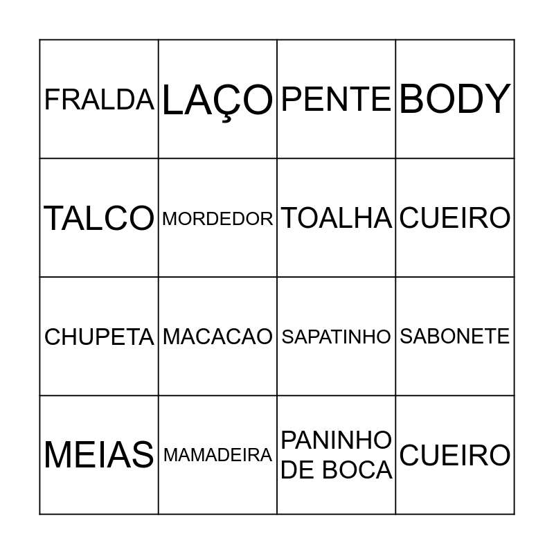 This bingo card has 16 words: MAMADEIRA, SABONETE, PENTE, FRALDA, CHUPETA, LAÇO, SAPATINHO, PANINHO DE BOCA, TALCO, MORDEDOR, MEIAS, BODY, MACACAO, CUEIRO, TOALHA and CUEIRO.