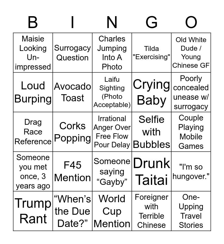 This bingo card has 30 words: Trump Rant, Kyle Secretly Background Posing, Laifu Sighting (Photo Acceptable), Dirty Diaper, Old White Dude / Young Chinese GF, Maisie Looking Un-impressed, Surrogacy Question, Someone saying “Gayby”, Selfie with Bubbles, One-Upping Travel Stories, Someone you met once, 3 years ago, Avocado Toast, Spilled Drink, Foreigner with Terrible Chinese, "I'm so hungover.", Disparaging Joke About France, Corks Popping, Irrational Anger Over Free Flow Pour Delay, Drunk Taitai, Poorly concealed unease w/ surrogacy, Drag Race Reference, “When’s the Due Date?”, Charles Jumping Into A Photo, Crying Baby, Couple Playing Mobile Games, Loud Burping, F45 Mention, World Cup Mention, Tilda "Exercising" and Mike Stashing Booze.