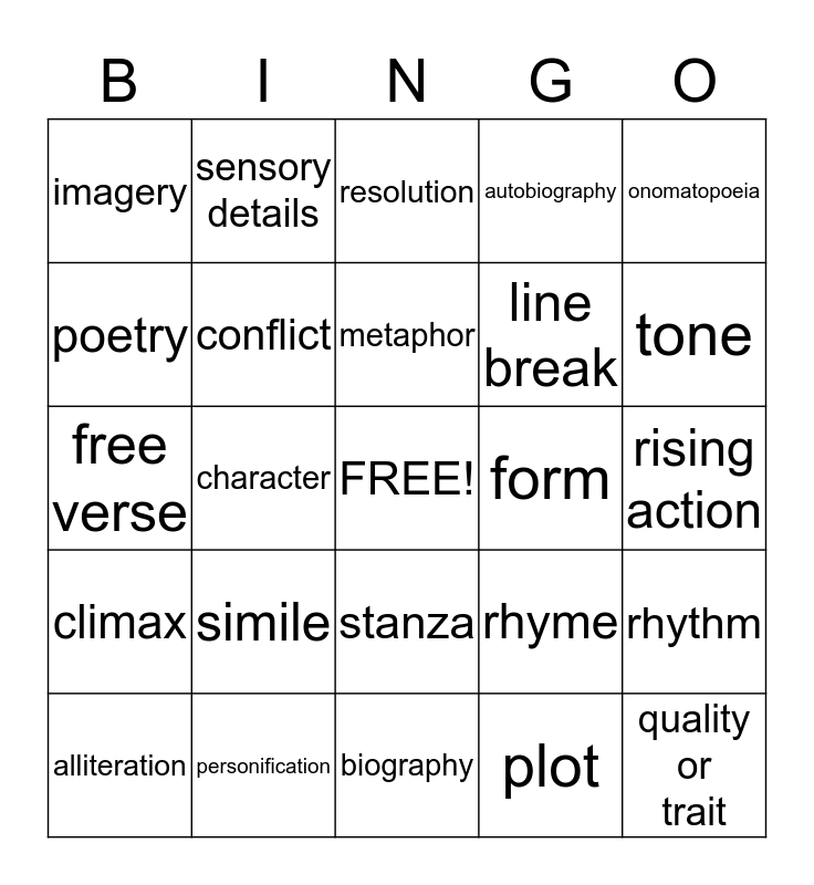 This bingo card has a free space and 24 words: simile, personification, metaphor, alliteration, onomatopoeia, imagery, poetry, sensory details, form, stanza, line break, free verse, rhyme, rhythm, conflict, plot, rising action, resolution, tone, character, quality or trait, climax, autobiography and biography.