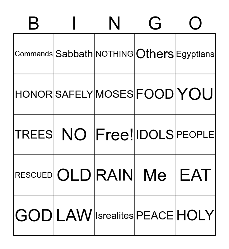 This bingo card has a free space and 24 words: OLD, LAW, MOSES, GOD, Egyptians, Commands, HONOR, Sabbath, IDOLS, RAIN, FOOD, TREES, Me, EAT, SAFELY, PEACE, PEOPLE, NOTHING, YOU, NO, HOLY, RESCUED, Others and Isrealites.