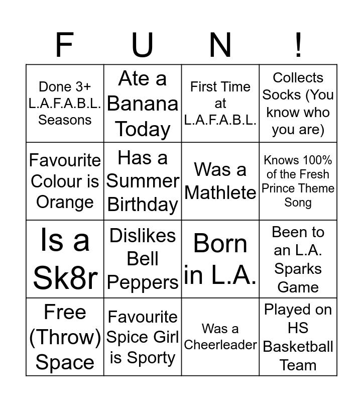 This bingo card has 16 words: Favourite Spice Girl is Sporty, Been to an L.A. Sparks Game, First Time at L.A.F.A.B.L., Done 3+ L.A.F.A.B.L. Seasons, Is a Sk8r, Ate a Banana Today, Born in L.A., Was a Cheerleader, Favourite Colour is Orange, Has a Summer Birthday, Free (Throw) Space, Collects Socks (You know who you are), Dislikes Bell Peppers, Knows 100% of the Fresh Prince Theme Song, Was a Mathlete and Played on HS Basketball Team.