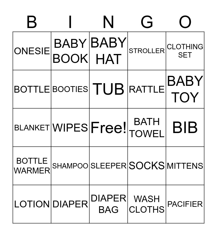 This bingo card has a free space and 24 words: LOTION, SHAMPOO, TUB, WASH CLOTHS, CLOTHING SET, ONESIE, BABY BOOK, BABY HAT, BATH TOWEL, BIB, BLANKET, BOOTIES, SOCKS, MITTENS, BOTTLE, DIAPER, DIAPER BAG, STROLLER, BABY TOY, BOTTLE WARMER, WIPES, SLEEPER, RATTLE and PACIFIER.