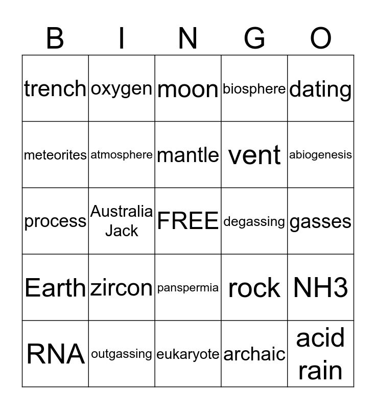 This bingo card has a free space and 24 words: zircon, outgassing, mantle, RNA, dating, trench, meteorites, oxygen, degassing, panspermia, vent, process, rock, NH3, atmosphere, archaic, gasses, moon, abiogenesis, Australia Jack, acid rain, Earth, biosphere and eukaryote.