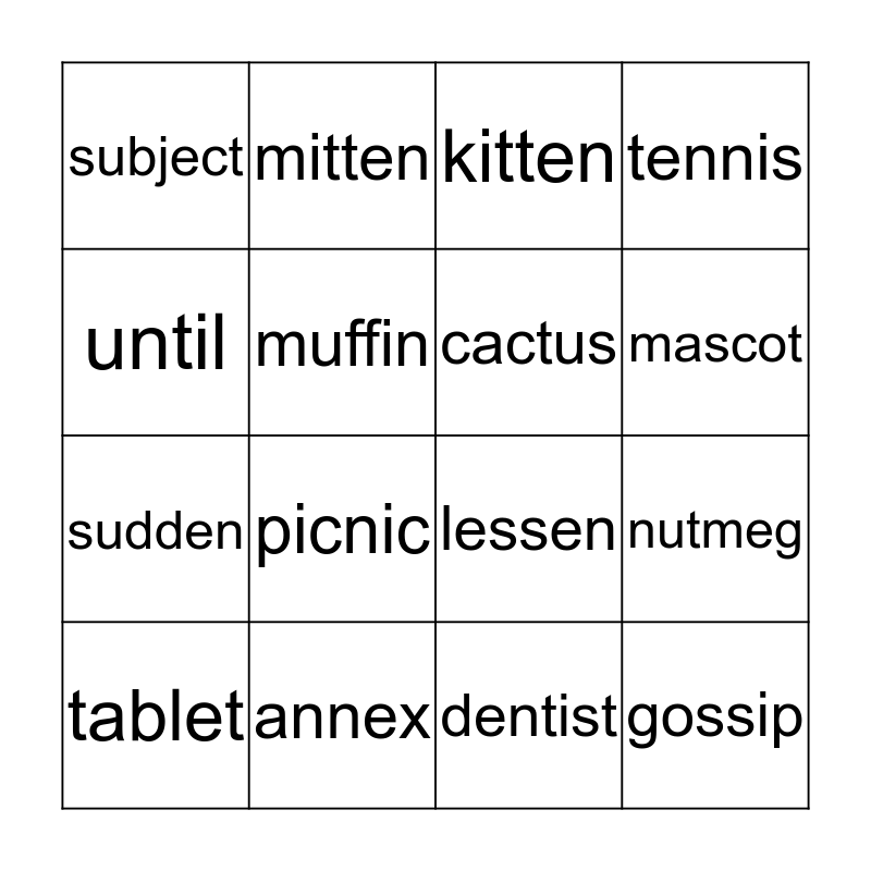 This bingo card has 27 words: Free!, traffic, sudden, rabbit, muffin, kitten, mitten, gossip, annex, connect, lessen, tennis, puppet, selfish, picnic, contact, cactus, mascot, problem, subject, dentist, hectic, nutmeg, tablet, insult, until and napkin.