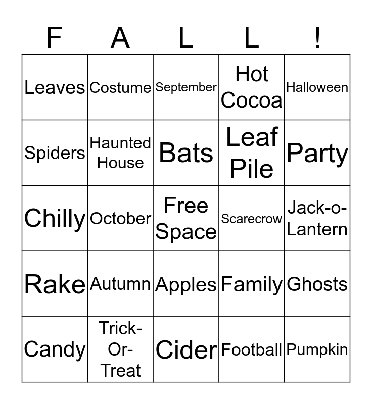 This bingo card has a free space and 24 words: Autumn, Trick-Or-Treat, Bats, Candy, Halloween, Leaves, Spiders, Costume, Scarecrow, Apples, Leaf Pile, Chilly, Family, Ghosts, Haunted House, Football, Jack-o-Lantern, September, Party, October, Pumpkin, Rake, Hot Cocoa and Cider.