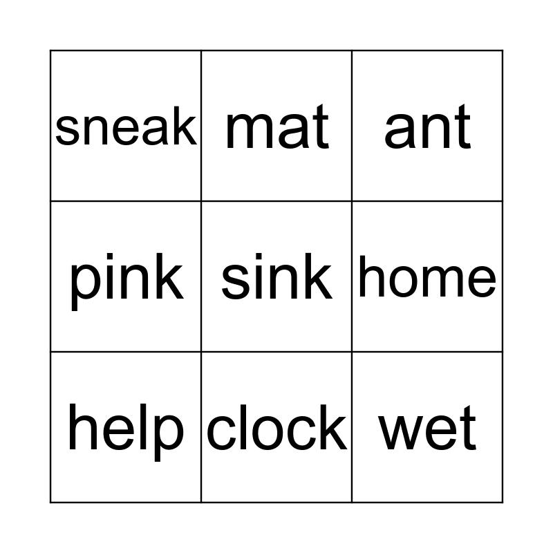 This bingo card has 9 words: help, ant, mat, pink, sneak, home, sink, wet and clock.