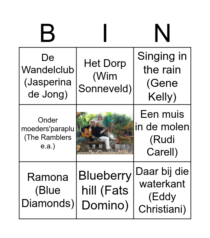 This bingo card has a free space and 25 words: Aan de Amsterdamse Grachten (Wim Sonneveld), Besame mucho (Dean Martin e.a.), Blueberry hill (Fats Domino), Brandend zand (Anneke Grönloh), Daar bij die waterkant (Eddy Christiani), De Wandelclub (Jasperina de Jong), Een muis in de molen (Rudi Carell), Het Dorp (Wim Sonneveld), Ik sta op wacht (Joop de Knegt), Jolene (Dolly Parton), Koffie koffie, lekker bakkie koffie (Rita Corita), Laat me (Ramses Shaffy), Loesje (Ramblers), Que Sera (Doris Day), Ramona (Blue Diamonds), Rawhide (Frankie Laine), Zachtjes tikt de regen… (Rob de Nijs), Singing in the rain (Gene Kelly), Sitting on the dock of the bay (Otis redding), Sophietje (Johnny Lion), Spring maar achterop (Eddy Christiani), Stijfselkissie (Zwarte Riek), Twee Motten (Tom Manders), Onder moeders'paraplu (The Ramblers e.a.) and Zeg niet nee-e-e-e (De Fouryo's).