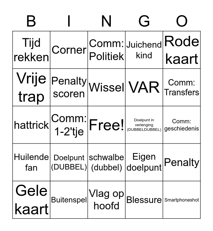 This bingo card has a free space and 24 words: Doelpunt (DUBBEL), Buitenspel, Wissel, Gele kaart, Rode kaart, Tijd rekken, Vrije trap, Corner, Doelpunt in verlenging (DUBBELDUBBEL), schwalbe (dubbel), VAR, hattrick, Eigen doelpunt, Penalty, Penalty scoren, Blessure, Comm: geschiedenis, Comm: Politiek, Comm: Transfers, Comm: 1-2'tje, Smartphoneshot, Huilende fan, Juichend kind and Vlag op hoofd.