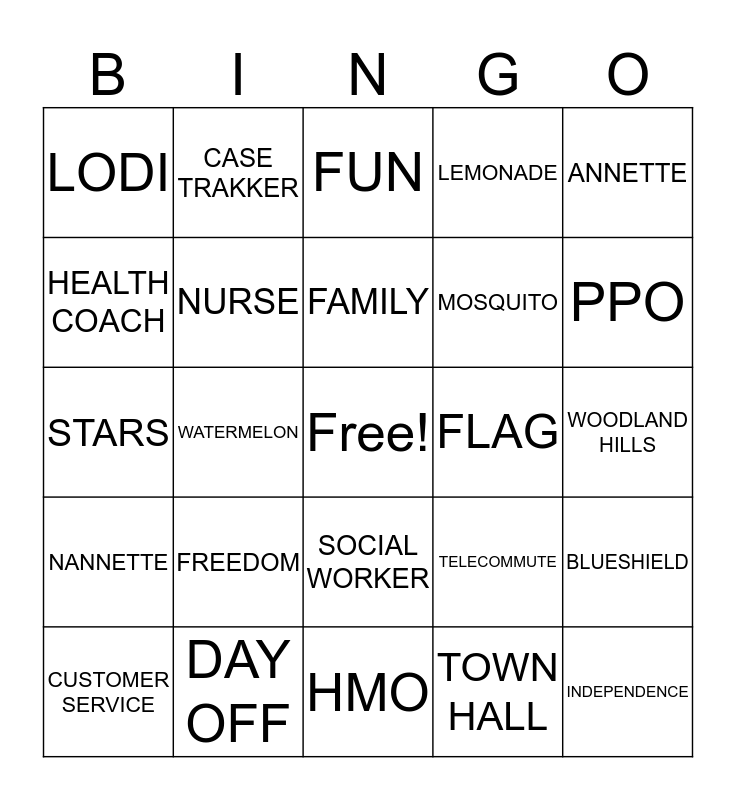 This bingo card has a free space and 39 words: PAUL, RIBS, INSURANCE, NURSE, CUSTOMER SERVICE, SOCIAL WORKER, FAMILY, FIREWORKS, ANNETTE, NANNETTE, WATERMELON, LEMONADE, INDEPENDENCE, WOODLAND HILLS, FLAG, FREEDOM, TEAM WORK, LODI, RANCHO CORDOVA, TELECOMMUTE, HEALTH COACH, HMO, MOSQUITO, PPO, LOVE POINTS, TRANSFER, SWIMMING, HOLIDAY, FACETS, CASE TRAKKER, 1776, DECLARATION, FUN, DAY OFF, TOWN HALL, LAUGHTER, BLUESHIELD, STARS and STRIPES.