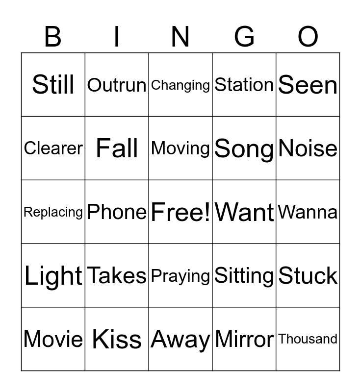 This bingo card has a free space and 81 words: Coming, Leaving, Changing, Getting, Alone, Lines, Watching, Call, Loved, Inside, Like, Rings, Station, Still, Dial, Clearer, Storm, Takes, Everything, Wanna, Drown, Seen, Replacing, Moving, Fall, Lips, Asleep, Brain, Might, Times, Noise, Trying, Away, Marlboro, Movie, Want, Playing, Head, Smoke, Hole, Thousand, Almost, Lost, Girl, Phone, Confess, Outrun, Voice, Lied, Back, Sitting, Stuck, Pick, Whatever, Forget, Midnight, Mess, Face, Staring, Just, Praying, Dont, Hear, Calling, Number, Hit, Mayer, Anything, Brakes, Favorite, Red, Light, Kiss, Dying, Whiskey, Mistake, Without, Mirror, Home, Song and Door.
