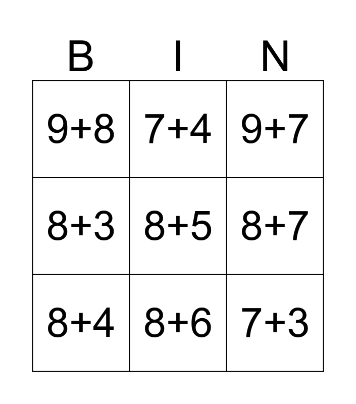 This bingo card has a free space and 17 words: 9+4, 9+6, 9+7, 9+8, 9+3, 8+3, 8+2, 8+4, 8+6, 8+7, 8+8, 8+9, 7+3, 7+4, 7+5, 7+6 and 7+7.