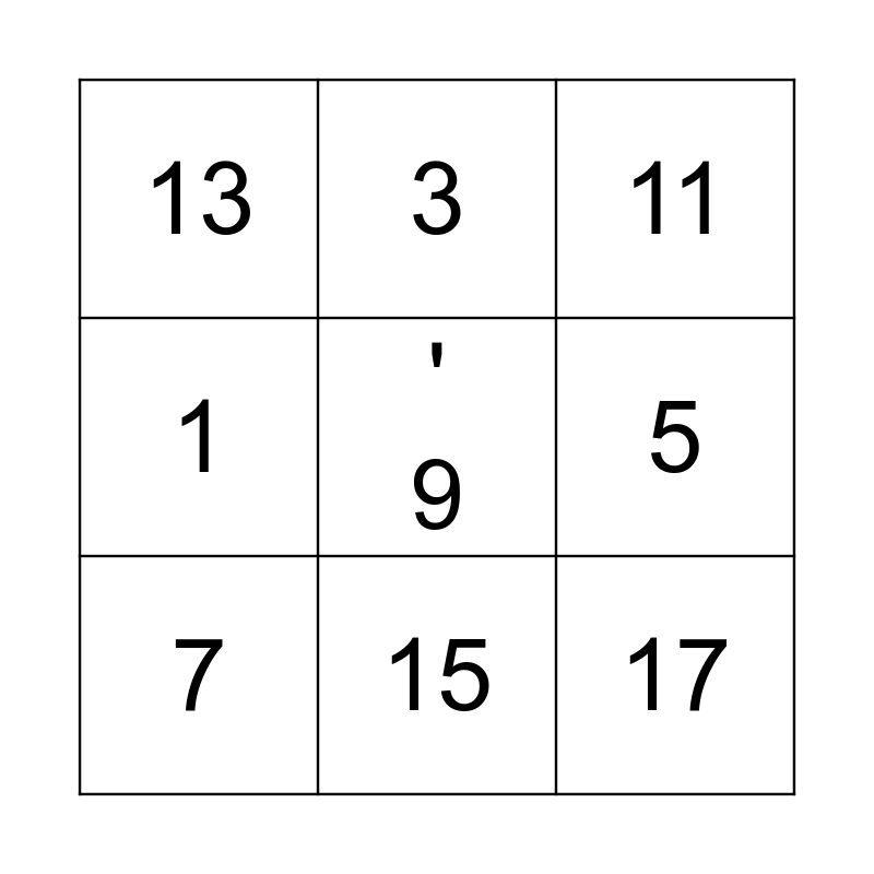 This bingo card has a free space and 8 words: 1, 3, 5, 7, 11, 13, 15 and 17.