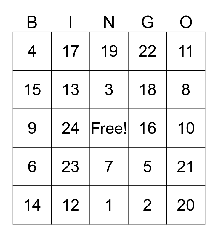 This bingo card has a free space and 24 words: 23, 12, 3, 14, 11, 4, 15, 17, 16, 7, 18, 9, 5, 21, 13, 2, 10, 19, 8, 24, 20, 6, 22 and 1.