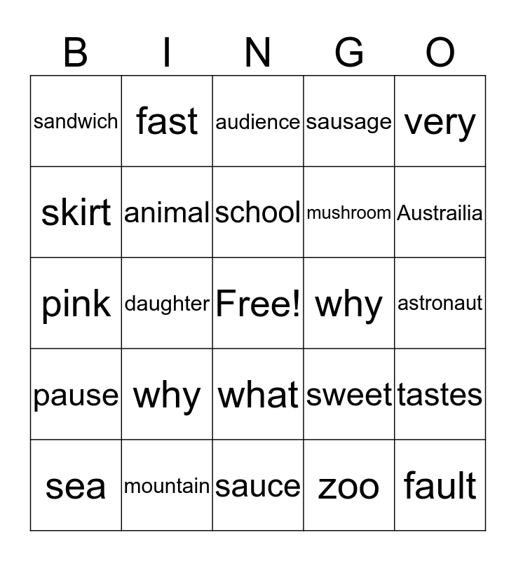 This bingo card has a free space and 24 words: why, mountain, school, sea, very, sandwich, skirt, fast, why, what, mushroom, pink, sweet, tastes, animal, zoo, astronaut, audience, Austrailia, daughter, fault, pause, sausage and sauce.