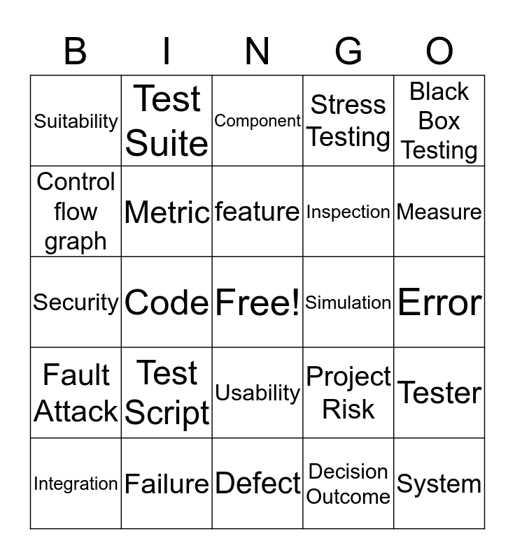 This bingo card has a free space and 24 words: Test Script, Failure, feature, Integration, Black Box Testing, Suitability, Control flow graph, Test Suite, Simulation, Usability, Inspection, Security, Project Risk, Tester, Metric, Decision Outcome, Error, Component, Measure, Code, System, Fault Attack, Stress Testing and Defect.
