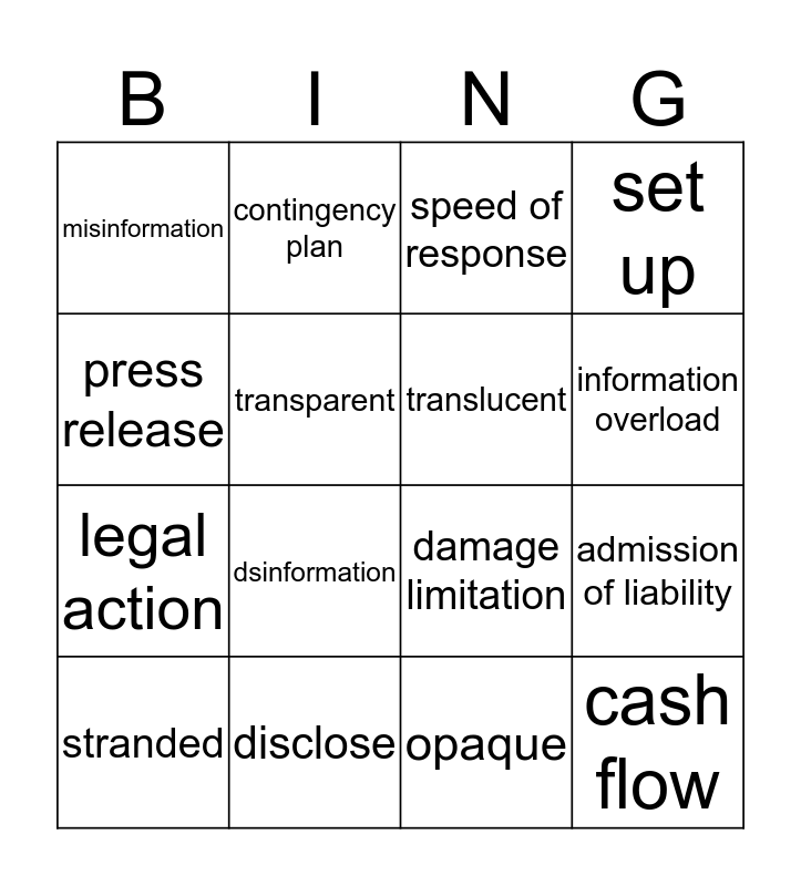 This bingo card has 16 words: disclose, admission of liability, speed of response, misinformation, legal action, contingency plan, damage limitation, opaque, press release, transparent, stranded, set up, dsinformation, information overload, translucent and cash flow.