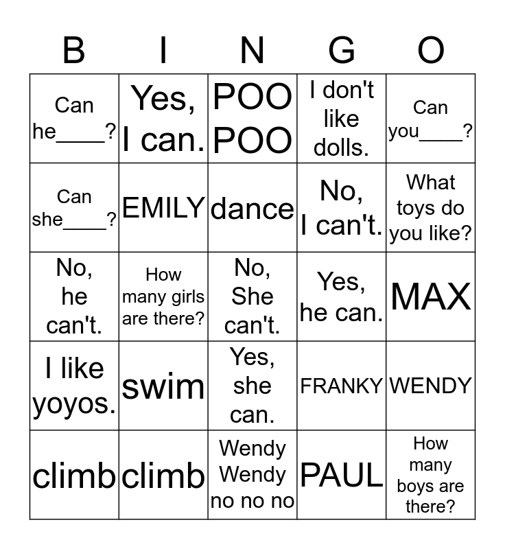This bingo card has a free space and 24 words: swim, climb, dance, climb, Can you____?, Can he____?, Can she____?, Yes, I can., Yes, he can., Yes, she can., No, I can't., No, he can't., FRANKY, WENDY, EMILY, PAUL, MAX, POO POO, What toys do you like?, How many girls are there?, How many boys are there?, I like yoyos., I don't like dolls. and Wendy Wendy no no no.