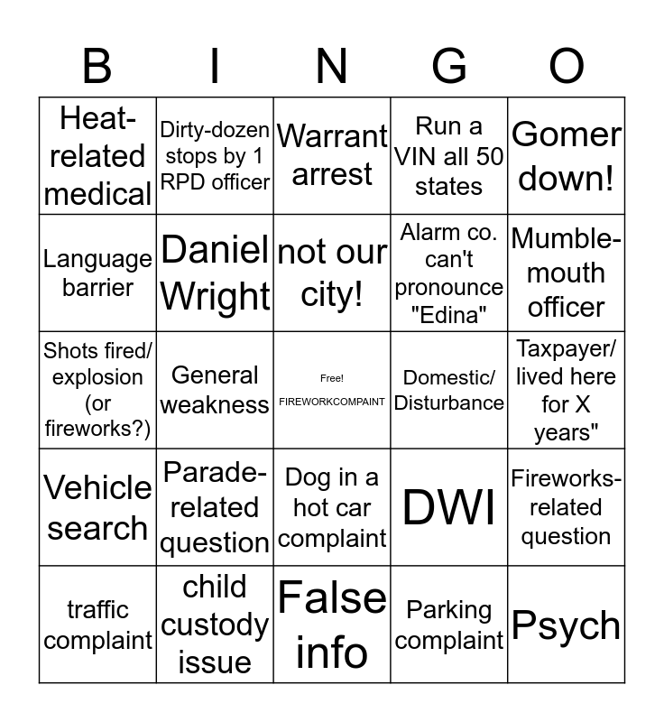 This bingo card has a free space and 24 words: Parade-related question, child custody issue, not our city!, traffic complaint, Gomer down!, Heat- related medical, Language barrier, Dirty-dozen stops by 1 RPD officer, Domestic/ Disturbance, Dog in a hot car complaint, Alarm co. can't pronounce "Edina", Shots fired/ explosion (or fireworks?), DWI, Fireworks-related question, Daniel Wright, Parking complaint, Taxpayer/ lived here for X years", Warrant arrest, Mumble-mouth officer, General weakness, Psych, Vehicle search, Run a VIN all 50 states and False info.