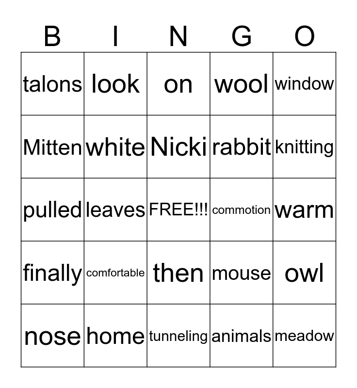 This bingo card has a free space and 24 words: comfortable, home, Nicki, nose, window, talons, Mitten, look, commotion, then, rabbit, pulled, mouse, owl, white, animals, warm, on, knitting, leaves, meadow, finally, wool and tunneling.