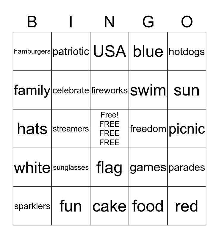 This bingo card has a free space and 24 words: sunglasses, fun, fireworks, sparklers, hotdogs, hamburgers, family, patriotic, freedom, flag, swim, hats, games, parades, celebrate, food, picnic, USA, sun, streamers, red, white, blue and cake.