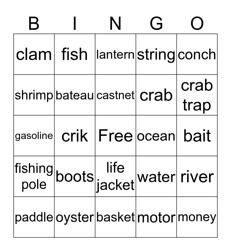 This bingo card has a free space and 24 words: boots, oyster, castnet, paddle, conch, clam, shrimp, fish, ocean, life jacket, crab, gasoline, water, river, bateau, motor, bait, lantern, crab trap, crik, money, fishing pole, string and basket.