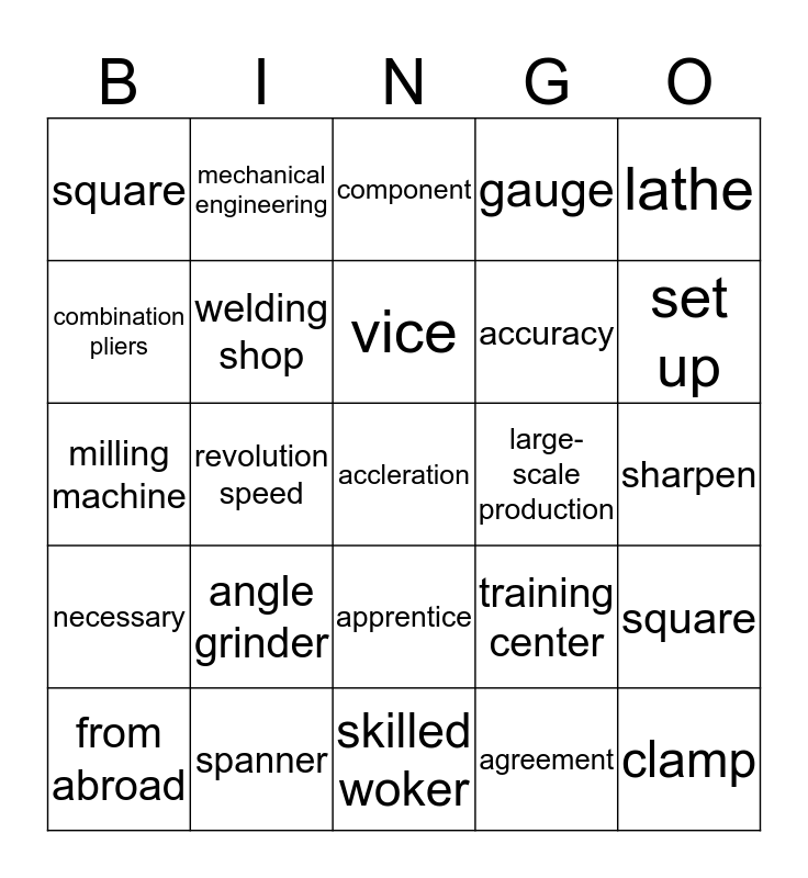 This bingo card has 25 words: angle grinder, skilled woker, vice, from abroad, lathe, square, combination pliers, mechanical engineering, large-scale production, apprentice, accuracy, milling machine, training center, square, welding shop, clamp, sharpen, component, set up, revolution speed, accleration, spanner, necessary, gauge and agreement.