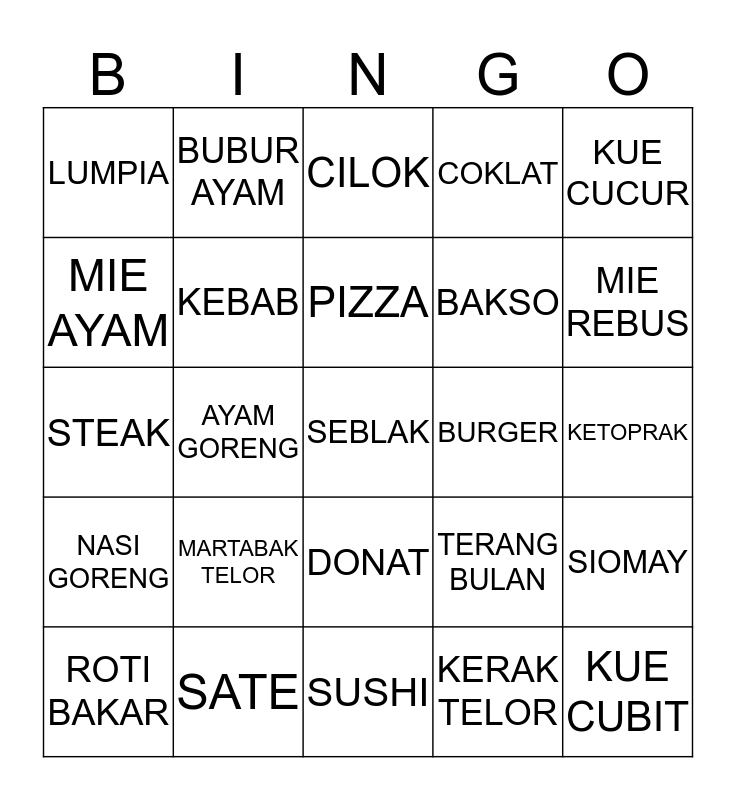 This bingo card has a free space and 24 words: MARTABAK TELOR, SATE, PIZZA, ROTI BAKAR, KUE CUCUR, LUMPIA, MIE AYAM, BUBUR AYAM, BURGER, DONAT, BAKSO, STEAK, TERANG BULAN, SIOMAY, KEBAB, KERAK TELOR, KETOPRAK, CILOK, MIE REBUS, AYAM GORENG, KUE CUBIT, NASI GORENG, COKLAT and SUSHI.