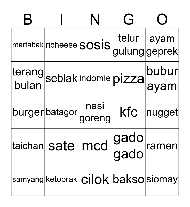 This bingo card has a free space and 24 words: sate, ketoprak, indomie, samyang, ayam geprek, martabak, terang bulan, richeese, kfc, mcd, pizza, burger, gado gado, ramen, seblak, bakso, nugget, sosis, bubur ayam, batagor, siomay, taichan, telur gulung and cilok.