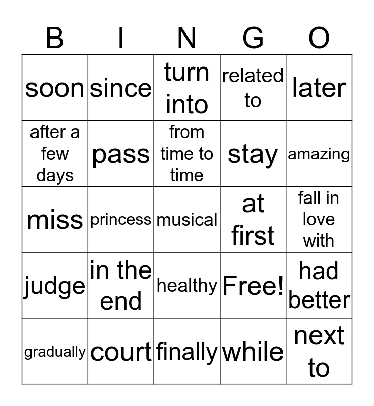 This bingo card has 25 words: in the end, finally, from time to time, gradually, later, soon, after a few days, since, at first, healthy, stay, miss, Free!, had better, pass, next to, fall in love with, turn into, amazing, princess, musical, court, judge, related to and while.