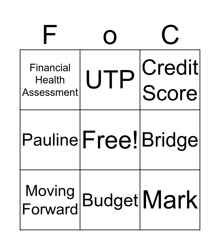 This bingo card has a free space and 12 words: Brenda, FOC, Mark, Pauline, UTP, Bridge, Moving Forward, Financial Coaching, Credit Score, Financial Health Assessment, Budget and Resource Room.