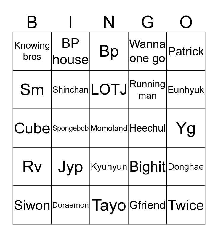 This bingo card has a free space and 24 words: Jyp, Doraemon, LOTJ, Siwon, Patrick, Knowing bros, Sm, BP house, Heechul, Kyuhyun, Running man, Cube, Bighit, Donghae, Shinchan, Gfriend, Yg, Bp, Eunhyuk, Spongebob, Twice, Rv, Wanna one go and Tayo.
