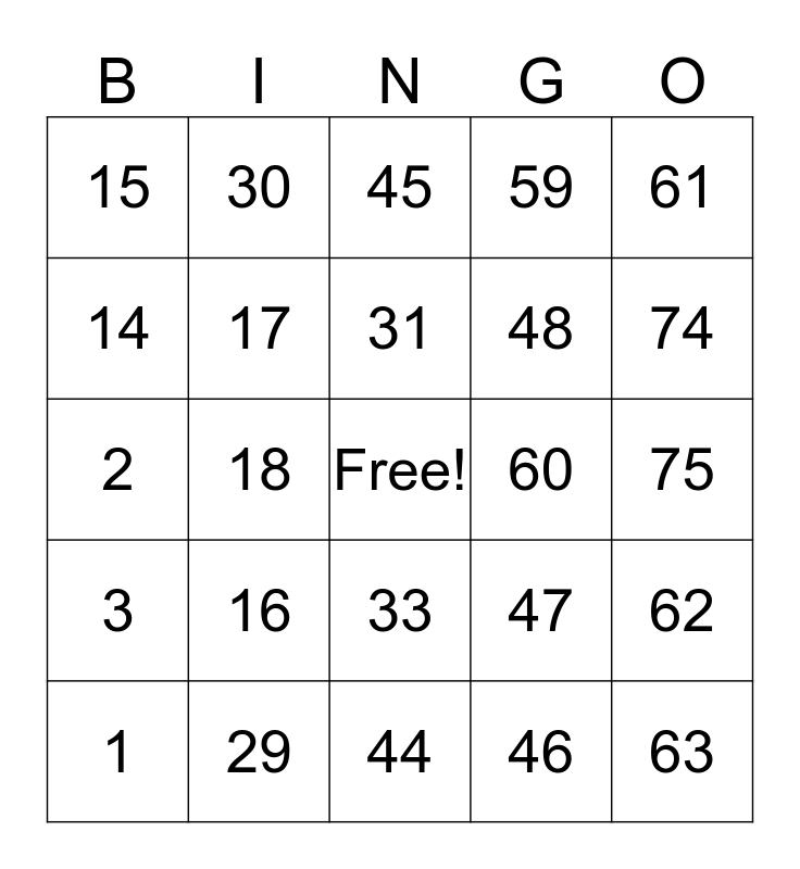This bingo card has a free space and 24 words: 1, 16, 31, 46, 61, 15, 30, 45, 60, 75, 2, 17, 47, 62, 14, 29, 44, 59, 74, 3, 18, 33, 48 and 63.
