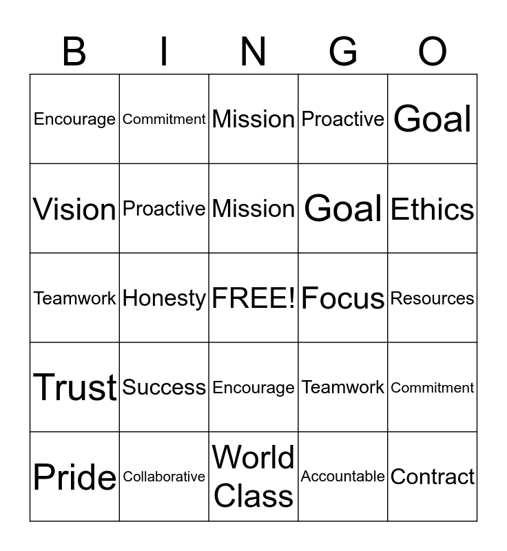 This bingo card has a free space and 44 words: Delivery, Contract, Honesty, Pride, Dedication, Accountable, Mission, Vision, Goal, Collaborative, Proactive, Focus, Encourage, Success, Resources, World Class, Innovative, Teamwork, Trust, Ethics, Commitment, Service, Service, Encourage, Success, Resources, World Class, Innovative, Teamwork, Trust, Ethics, Commitment, Delivery, Contract, Honesty, Pride, Dedication, Accountable, Mission, Vision, Goal, Collaborative, Proactive and Focus.