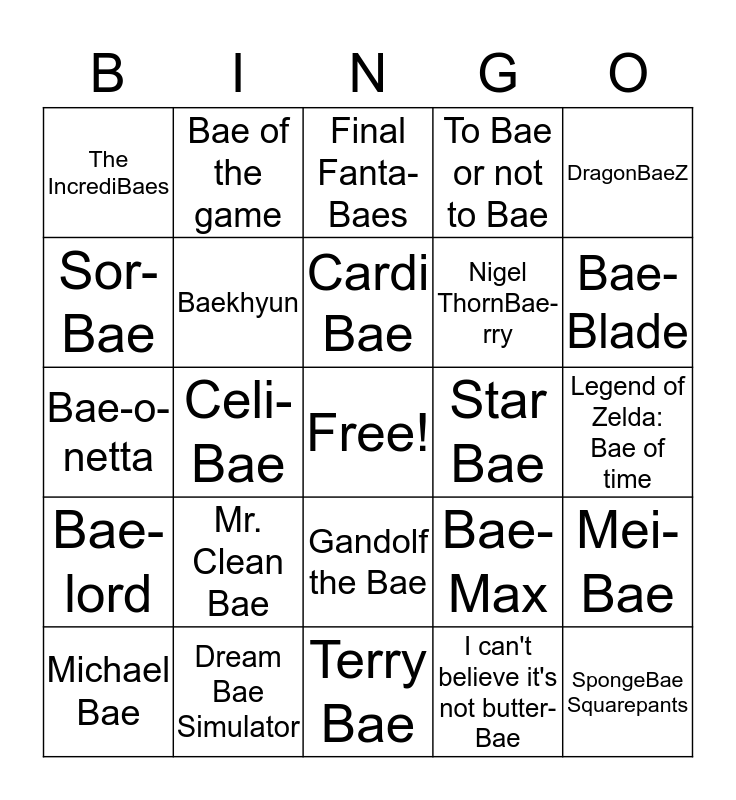 This bingo card has a free space and 24 words: Michael Bae, Mr. Clean Bae, Cardi Bae, I can't believe it's not butter-Bae, DragonBaeZ, The IncrediBaes, Bae of the game, Final Fanta-Baes, Star Bae, Legend of Zelda: Bae of time, Bae-o-netta, Baekhyun, Bae-Max, Mei-Bae, Sor-Bae, Dream Bae Simulator, Terry Bae, To Bae or not to Bae, Bae-Blade, Bae-lord, Celi-Bae, Gandolf the Bae, Nigel ThornBae-rry and SpongeBae Squarepants.
