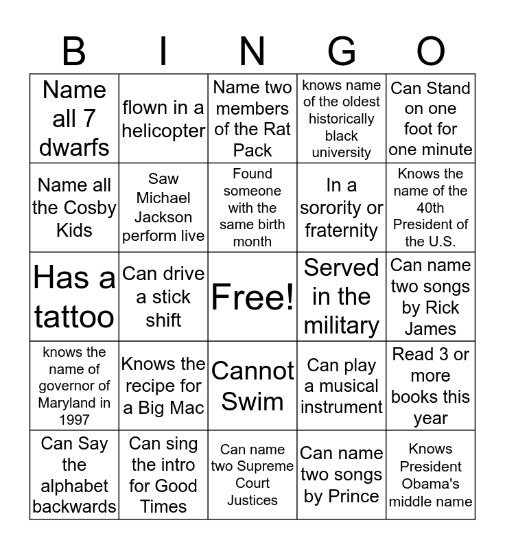 This bingo card has a free space and 24 words: Knows the recipe for a Big Mac, Can sing the intro for Good Times, Found someone with the same birth month, Can Say the alphabet backwards, Can Stand on one foot for one minute, Name all 7 dwarfs, Name all the Cosby Kids, flown in a helicopter, Served in the military, Cannot Swim, In a sorority or fraternity, Has a tattoo, Can play a musical instrument, Read 3 or more books this year, Saw Michael Jackson perform live, Can name two songs by Prince, Can name two songs by Rick James, Name two members of the Rat Pack, Knows the name of the 40th President of the U.S., Can drive a stick shift, Knows President Obama's middle name, knows the name of governor of Maryland in 1997, knows name of the oldest historically black university and Can name two Supreme Court Justices.