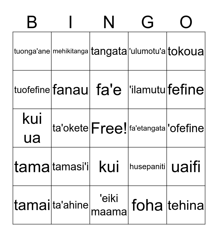 This bingo card has a free space and 24 words: tamasi'i, ta'ahine, fa'e, tamai, tokoua, tuonga'ane, tuofefine, mehikitanga, fa'etangata, kui, 'ilamutu, kui ua, husepaniti, uaifi, fanau, foha, 'ofefine, tangata, fefine, ta'okete, tehina, tama, 'ulumotu'a and 'eiki maama.