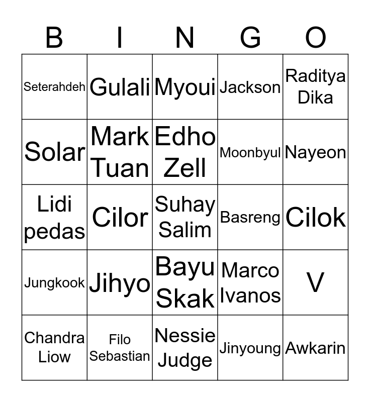 This bingo card has a free space and 24 words: Jihyo, Filo Sebastian, Edho Zell, Chandra Liow, Raditya Dika, Seterahdeh, Solar, Gulali, Basreng, Bayu Skak, Moonbyul, Lidi pedas, Marco Ivanos, V, Mark Tuan, Jinyoung, Cilok, Myoui, Nayeon, Cilor, Awkarin, Jungkook, Jackson and Nessie Judge.