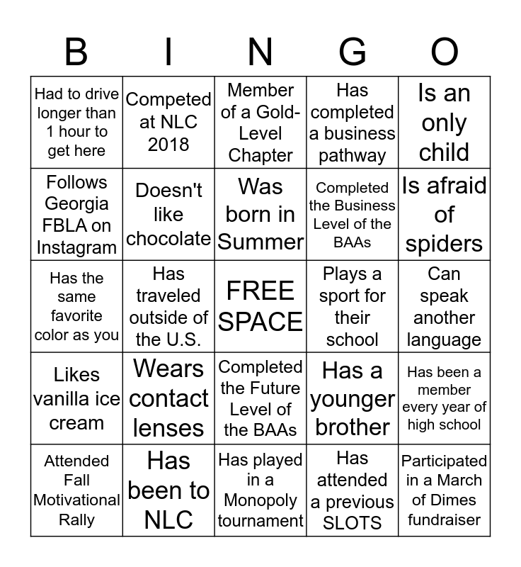 This bingo card has a free space and 24 words: Wears contact lenses, Has been to NLC, Was born in Summer, Attended Fall Motivational Rally, Is an only child, Had to drive longer than 1 hour to get here, Follows Georgia FBLA on Instagram, Competed at NLC 2018, Plays a sport for their school, Completed the Future Level of the BAAs, Completed the Business Level of the BAAs, Has the same favorite color as you, Has a younger brother, Has been a member every year of high school, Doesn't like chocolate, Has attended a previous SLOTS, Can speak another language, Member of a Gold-Level Chapter, Is afraid of spiders, Has traveled outside of the U.S., Participated in a March of Dimes fundraiser, Likes vanilla ice cream, Has completed a business pathway and Has played in a Monopoly tournament.