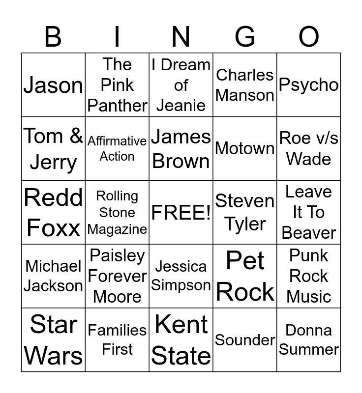 This bingo card has a free space and 24 words: Paisley Forever Moore, Families First, James Brown, Star Wars, Psycho, Jason, Tom & Jerry, The Pink Panther, Steven Tyler, Jessica Simpson, Motown, Redd Foxx, Pet Rock, Punk Rock Music, Affirmative Action, Sounder, Leave It To Beaver, I Dream of Jeanie, Roe v/s Wade, Rolling Stone Magazine, Donna Summer, Michael Jackson, Charles Manson and Kent State.