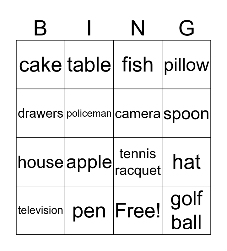 This bingo card has 17 words: Free!, television, fish, cake, apple, pillow, hat, camera, spoon, policeman, pen, tennis racquet, drawers, table, house, shoes and golf ball.